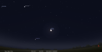 – La Lune est conjointe à Saturne à 7h46 dans le plan écliptique et à 10h35 dans le plan équatorial, l’étoile3,5° au Nord. Les deux astres se lèvent peu avant 0h30 légales , Spica coiffant le pôle Nord de la Lune. Ci-dessous à 7h légales.