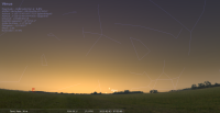 – Vénus, devant la constellation du Sagittaire depuis le 6 janvier, arrive devant le Capricorne le 1er février à 22h14. Elle ne se lève plus que 34mn avant le Soleil le 3 février, dans la lueur du Soleil qui la talonne. Son élongation n’est plus que de 13°. De magnitude toujours proche de -4 (-3.9), son diamètre apparent diminue (10 secondes d’arc) et sa fraction éclairée augmente (97%). Les observateurs aguerris peuvent encore tenter de saisir son étincelle à l’horizon Sud-Est peu avant le lever de l’astre du jour. Ci-dessous le 3 à 7h55 légales.