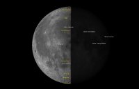 – libration maximale en latitude pour la Lune (B = 6,87°) : aux alentours de 0h (dès son lever), la demi Lune dévoile son Nord au maximum et permet d’admirer le coucher du Soleil le long du terminateur, plus particulièrement sur Goldschmidt, Platon, Archimedes, Alpetragius, Orontius, Maginus et Moretus.