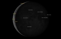 – libration minimale en longitude pour la Lune (L = -5,57°) : aux alentours de 4h (dès son lever), la Lune dévoile son Ouest au maximum et laisse admirer le coucher du Soleil le long du terminateur du fin croissant, plus particulièrement sur Pythagoras, Seleucus, Hevelius, Grimaldi et la corne Sud.