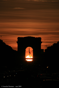 – Le 10 mai à Paris à 21h03, depuis le rond-point des Champs-Elysées, il passe au centre de l’arche de l’arc de Triomphe juste avant son coucher. Cette scène se reproduit chaque année à la même date ainsi que le 2 août. Voir cette page