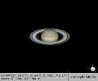 – Distance à la Terre : 9,01 UA. Elle a atteint son périgée le 23 mai . La distance Terre-Saturne augmente désormais jusqu’à sa prochaine conjonction le 30 novembre. Opposition suivante le 3 juin 2016.
