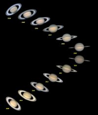 – L’inclinaison de ses anneaux passe de 24,3° à 24,0° au cours du mois de juin. (Le signe + signale l’inclinaison vers le Nord : nous voyons principalement cet hémisphère depuis le 4 septembre 2009 et le Soleil l’éclaire majoritairement depuis le 10 août 2009 - c’est la saison printemps-été de l’hémisphère Nord /automne-hiver de l’hémisphère Sud- sur Saturne, une saison dure environ 7 de nos années ).