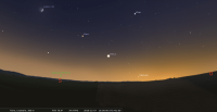 - Le 12 décembre, aux alentours de 6h, elle se trouve à 0,5° de l’ étoile theta Virginis ; des jumelles sont nécessaires pour distinguer l’étoile dans l’éclat de Jupiter qui brille 300 fois plus fort.