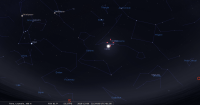 - A 10h42, la Lune est conjointe aux Pléiades (M45) dans le plan équatorial, l’amas ouvert 9°16’ au Nord. L’ensemble se lève peu aavant 17h ; à 19h la Lune et l’amas sont à l’Est, la Lune à 25° de hauteur, les Pléiades, presque 10° au-dessus ; ils culminent aux alentours de minuit (0h), mais dans le vif éclat de la Lune presque pleine, il faut des jumelles pour distinguer l’amas.