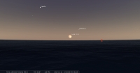 – Cette conjonction donne lieu à une occultation d’Aldébaran par la Lune visible depuis l’Océan Pacifique, Hawaii, l’Amérique du Nord, le sud du Groenland, l’Océan Atlantique, l’ouest de l’Europe et le nord-ouest de l’Afrique. C’est la vingt sixième d’une longue série d’occultations d’Aldébaran par la Lune qui prendra fin le 3 septembre 2018. Pour notre localisation, c’est à 6h23 qu’Aldébaran disparaît derrière la Lune. Les deux astres sont alors à 7° de hauteur et la fraction éclairée de la Lune est de 99%.
