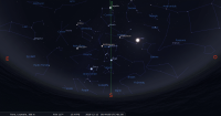 – A 22h24, la Lune est conjointe à Uranus dans le plan écliptique, Δ -2°51’ ; longitude 20°43’ (21e BEL). A l’heure de la conjonction, les deux astres sont au Sud-Est à plus de 45° de hauteur. Repérer la position d’Uranus par rapport à la Lune, ainsi que celles de Cérès et d’Eris