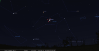 – A 4h59, elle est conjointe à Regulus dans le plan écliptique, l’étoile (alpha Leo) 0°48’ au Nord ; longitude (moyenne de la date) 150°4’3" - Régulus marque de nos jours, l’entrée dans le signe de la Vierge. Les deux astres se lèvent aux alentours de 20h30 pour notre localisation, Lune la première ; ils culminent un peu avant 3h, à près de 60° de hauteur.