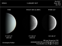 - Visible depuis le début du mois dans le ciel du matin, elle atteint son élongation maximale le 19 janvier à 10h43 : 24°4’57" à l’Ouest du Soleil ; longitude 275°24’ (6e CAP) ; latitude +1°21’ (descend). Page spéciale PGJ.Elle reste visible tout le mois dans d’assez bonnes conditions. Elle se lève peu après 6h45. Magnitude +0.9 à +0.7 (éclat en augmentation) ; diamètre apparent de 8 à 7 secondes d’arc