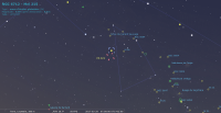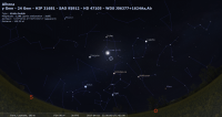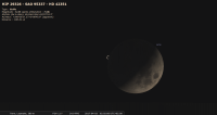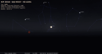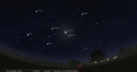 - A 2h02 (pour notre localisation), occultation d’étoile par la Lune : nous pouvons assister à la disparition de HD 42 351 (Orion, magnitude 6.4), du côté sombre du disque lunaire puisque nous sommes en Lune croissante ; les deux astres sont alors à 5° de hauteur environ, la portion éclairée de la Lune étant de 41%. Nous ne pouvons assister à la réapparition de l’étoile, car elle a lieu après leur coucher .