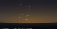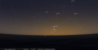 – A 13h33, la Lune est conjointe à Mars dans le plan écliptique, Δ -5,3° ; longitude 59°28’ (30e TAU). Jolie scène au crépuscule, remarquer le déplacement de ola Lune depuis la veille.