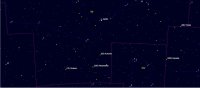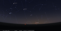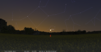 - A 2h02 (pour notre localisation), occultation d’étoile par la Lune : nous pouvons assister à la disparition de HD 42 351 (Orion, magnitude 6.4), du côté sombre du disque lunaire puisque nous sommes en Lune croissante ; les deux astres sont alors à 5° de hauteur environ, la portion éclairée de la Lune étant de 41%. Nous ne pouvons assister à la réapparition de l’étoile, car elle a lieu après leur coucher .