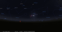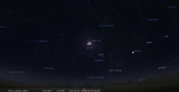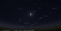 - A 14h38, la Lune est conjointe à Neptune dans le plan équatorial, la planète 0°44’ au Nord ; élongation solaire de Neptune 101° Ouest. Les deux astres se lèvent un peu avant 2h. La Lune permet de repérer la position de Neptune.