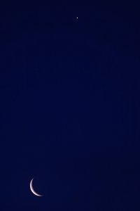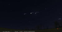 - A 22h23, premier croissant de cette lunaison, théoriquement facilement visible à l’oeil nu, 41 heures 52 minutes après la Nouvelle Lune ; de 4,55%, devant le Cancer (Can) à la limite des Gémeaux (Gem), à 4° de hauteur au-dessus de l’horizon, azimut 290°, 45 minutes après le coucher du Soleil, celui-ci étant alors à 6° sous l’horizon ; ce premier croissant de Lune se couche à 22h50 pour notre localisation, à l’azimut 295° ; longitude écliptique 29e CAN.