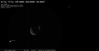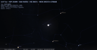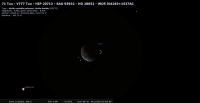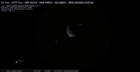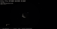 puis, quasi simultanément 78 Tau, magnitude 3.4 de 4h33 à 5h38 et 77 Tau, magnitude 3.8 de 4h34 à 5h39. Les étoiles disparaissent du côté éclairé du disque lunaire et réapparaissent du côté sombre puisque nous sommes en Lune décroissante ; à la réapparition de 77 Tau les astres sont à l’Est, à 30° de hauteur environ, la portion éclairée de la Lune étant de 38%. (horaires pour notre localisation)