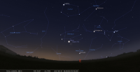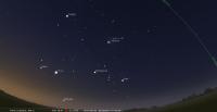- A 6h22, dernier croissant de Lune théoriquement facilement visible à l’oeil nu : de 3,38%, 38 heures et 8 minutes avant la Nouvelle Lune, à 9° de hauteur et 76° d’azimut pour notre localisation, le Soleil étant à 7° sous l’horizon ; il se lève 1 heure 4 minutes avant le Soleil, à 5h18, à l’ azimut 65° pour notre localisation ; longitude 7e LIO ; en compagnie de l’amas de la Crèche.