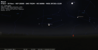 – A 6h18, la Lune atteint sa latitude minimale : -5°17’8" au Sud du plan de l’écliptique ("ventre du Dragon") ; longitude : 54°12’ (25e TAU) ; ascension droite 3h32m43s, déclinaison +13°41’ -monte.