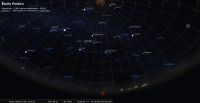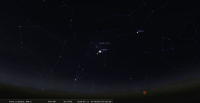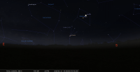 – A 4h37, la Lune est conjointe à Spica dans le plan équatorial, l’étoile (alpha Virgo) 7°22’ au Sud. La Lune se lève aux alentours de 1h10, suivie par Spica 35 minutes plus tard ; les deux astres culminent aux alentours de 7h, alors que Mercure se lève.