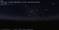 A 3h04, la Lune est conjointe à Saturne dans le plan écliptique, la planète 2°13’ au Sud ; longitude 277°59’ (8e CAP). Les deux astres se lèvent un peu avant 4h, au-dessus de Nunki.