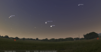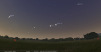 – Devant la constellation des Poissons (Psc) depuis le 2 mars ; elle y effectue sa rétrogradation, du 22 mars au 13 avril dans le plan équatorial (23 mars au 15 avril dans le plan écliptique) ; elle arrivera devant la Baleine (Cet) le 22 avril.