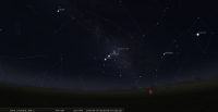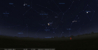 – A 19h40, la Lune est conjointe à Mars dans le plan écliptique, la planète 3°8’ au Sud ; longitude 281°42’ (12e CAP). Remarquable dans le ciel du matin, avec Saturne ; Mars se lève aux alentours de 3h20.