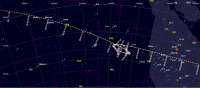 – Ci-contre, sa position devant les constellations (référentiel équatorial) à notre époque, jour après jour à 13h du 1er mars (11e POI) au 28 août (5e VIE) (les planètes sont positionnées au 1er mars). Rappelons que la précession des équinoxes décale sa position devant les étoiles d’un degré tous les 70 ans.
