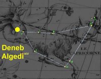 - Deneb Algedi se situe elle à l’extrémité Est de cette « grande bouche » à peu près à la même distance de sa voisine Nashira que ne l’est Giedi - (Algedi) de sa voisine Dabih mais dans un alignement perpendiculaire.