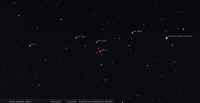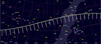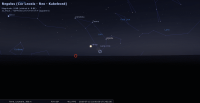 – Ci-contre, sa position devant les constellations (référentiel équatorial) à notre époque, jour après jour à du 1er mai, 14h (11e TAU) au 25 octobre, 14h (3e SCO) (les planètes sont positionnées au 1er mai). Rappelons que la précession des équinoxes décale sa position devant les étoiles d’un degré tous les 70 ans.