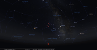 – Mais la diminution de son éclat (sa magnitude passe de +0.5 à +0.9), l’inclinaison progressive de l’écliptique sur l’horizon et son passage au sud de ce plan concourent à rendre son repérage de plus en plus délicat et impossible à l’œil nu après le 15 juillet.
