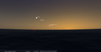 – A 0h03, la Lune est conjointe à Mercure dans le plan équatorial, la planète 2°11’ au Sud ; élongation solaire de la Lune 26° Est. Le premier croissant de Lune jouxte Mercure qui est à la limite de visibilité à l’oeil nu dans le ciel crépusculaire.