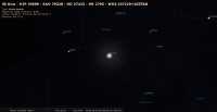 – A 11h48, la Lune, est conjointe à l’amas de la Crèche (Messier 44 ; m 3.1) dans le plan écliptique, l’amas ouvert 0°54’ au Nord ; longitude du centre de l’amas 127°37’3". Cet amas, visible à l’œil nu par un bon ciel (sans Lune) sous la forme d’une tache floue et facilement visible aux jumelles, se niche dans la constellation du Cancer et marque de nos jours le 8e degré du signe du Lion. Dans notre ciel, la nuit précédente, la Lune se lève peu avant 2h, suivie par l’amas, vingt minutes plus tard. A apprécier aux jumelles jusqu’à la fin de la nuit.
