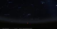 – Aux alentours de 7h35 (pour notre localisation), dernier croissant de Lune, visible avec un instrument et peut-être à l’œil nu : de 1,28%, 22 heures 11 minutes avant la Nouvelle Lune ; pour notre localisation, il se trouve à 7° de hauteur et 93° d’azimut, le Soleil étant à 4° sous l’horizon ; la Lune se lève 1 heure 8 minutes avant le Soleil, à 6h49, à l’azimut 86° ; elle marque alors le 4e degré du signe de la Balance.