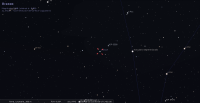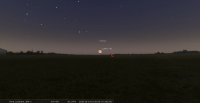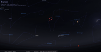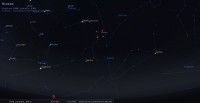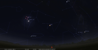 - A 0h30, la Lune est conjointe à Neptune dans le plan équatorial, la planète 0°30’ au Nord ; élongation solaire de la Lune 135° Est. Cette nuit, la Lune signale la position de Neptune ; les deux astres culminent aux alentours de 23h et se couchent aux alentours de 4h30.
