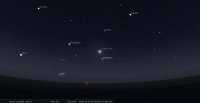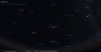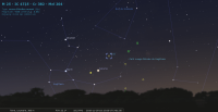 – A 12h17, elle est conjointe à Regulus dans le plan écliptique, ∆ +2°16’ ; longitude (moyenne de la date) 150°5’47". Régulus marque de nos jours, l’entrée (des astres proches de l’éclimtique) dans le signe de la Vierge. Dans la nuit qui précède, pour notre localisation, la Lune se lève peu avant 23h suivie par Régulus une quarantaine de minutes plus tard ; les deux astres culminent à près de 60° de hauteur en fin de nuit, aux alentours de 7h.
