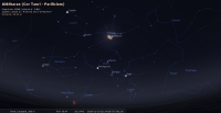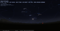 - A 2h12, la Lune est conjointe aux Pléiades dans le plan équatorial, l’amas ouvert (Messier 45) 8°42’ au Nord. Cette nuit, elles accompagnent la Pleine Lune et sont noyées dans son éclat.