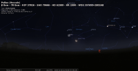- A 21h42, la Lune est conjointe à Pollux (beta Gémeaux ; m 1.1) dans le plan écliptique, l’étoile 7°6’ au Nord ; longitude (moyenne de la date) 113°28’52" (elle marque le 24e CAN). Ce soir dans notre ciel, Pollux se lève aux alentours de 20h04, suivie par la Lune, une trentaine de minutes plus tard ; culmination aux alentours de 4h15.