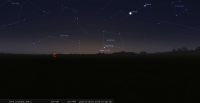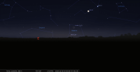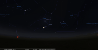 – A 19h42, la Lune est conjointe à Vénus dans le plan équatorial, la planète 3°38’ au Sud ; élongation solaire de Vénus 41° Ouest. Les deux astres sont proches de Spica dans le ciel du matin