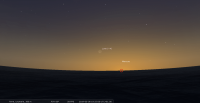 – Ce soir, aux alentours de 19h20, dans les lueurs crépusculaires au raz d’un horizon Ouest parfaitement dégagé, des jumelles sont très probablement nécessaires pour distinguer Mercure, de magnitude 1.6, au-dessus du très fin croissant de Lune, également très délicat à distinguer à l’œil nu.