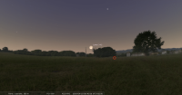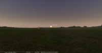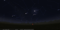 - A 13h35, la Lune est conjointe à Jupiter dans le plan équatorial, la planète 1°39’ au Sud ; élongation solaire de Jupiter 129° Ouest. Au cours de la nuit précédente, Jupiter se lève aux alentours de 1h pour notre localisation, suivie par la Lune, 25 minutes plus tard ; culmination aux alentours de 5h15 à 22° de hauteur environ.