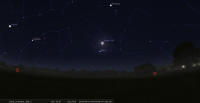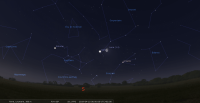 - A 1h09, la Lune est conjointe à l’étoile Nunki (sigma Sagittaire ; m 2.05) dans le plan écliptique, l’étoile 4°10’ au Sud. En raison de la précession des équinoxes, Nunki marque de nos jours le 13e degré du signe du Capricorne (longitude 282°39’36"). La conjonction dans le plan équatorial a lieu à 3h56, Δ+4°9’. Cette nuit, la Lune se lève aux alentours de 2h15 pour notre localisation, suivie par Nunki, un quart d’heure plus tard. A l’orée du jour, les deux astres sont à une vingtaine de degrés de hauteur, proches de leur culmination.