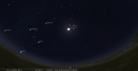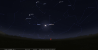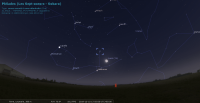 - A 15h00, la Lune est conjointe aux Pléiades dans le plan équatorial, l’amas ouvert (Messier 45) 7°38’ au Nord. L’ensemble culmine aux alentours de 23h30. La Lune, éclairée à 98% ne permet guère l’observation de l’amas.