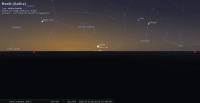 - De 5h58 à 7h00 pour notre localisation, la Lune occulte l’étoile HD 154 418 (Ophiuchus, magnitude 6.3). L’étoile disparaît du côté éclairé et réapparaît du côté sombre de la Lune en croissant. Sa portion éclairée est de 13% ; à la disparition de l’étoile, les deux astres sont tout juste levés, à 4° de hauteur au Sud-Est ; à sa réapparition, il sont à 12° de hauteur environ.