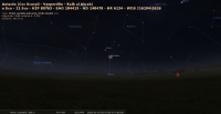 – Ci-contre, sa position devant les constellations à notre époque, jour après jour du 1er décembre 2019, 0h TU (9e SAG) au 28 maI 2020, 0h TU (8e GEM) (grille équatoriale ; les planètes sont positionnées au 1er décembre 2019.