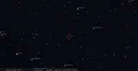 devrait occulter une étoile de la constellation du Cancer (Cnc), de magnitude 11.6 : TYC 784-00088-1, ascension droite (J2000) 7h56m41s, déclinaison +9°50’27".