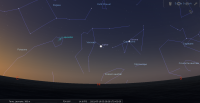 - A 0h02, la Lune est conjointe à Vénus dans le plan équatorial, la planète 0°43’ au Nord ; élongation solaire de la Lune 12° Est.