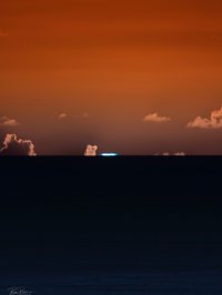 Les rayons bleus répondent au même principe que les rayons verts. Un mirage magnifie de minuscules différences dans la réfraction atmosphérique de la lumière rouge, verte et bleue. Les rayons bleus sont plus difficiles à voir que les rayons verts parce que les rayons bleus se fondent dans le ciel bleu environnant. Lorsque l’air est exceptionnellement clair, cependant, le rayon bleu émerge.