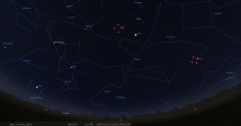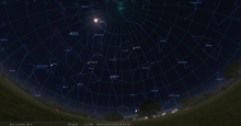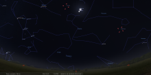 – A 21h40, la Lune est conjointe à Jupiter dans le plan équatorial, la planète 2°46’ au Sud ; élongation solaire de Jupiter 99° Est