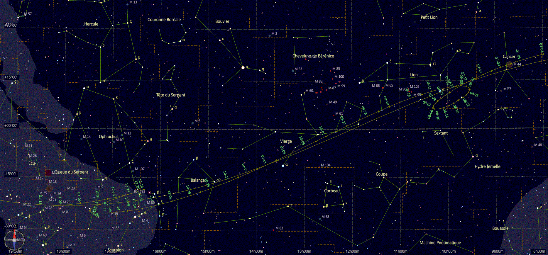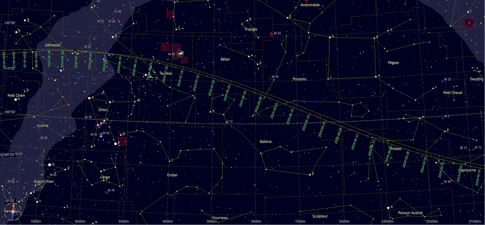 – A 22h57, l’astéroïde (13) Egeria est à l’opposition du Soleil dans le plan équatorial