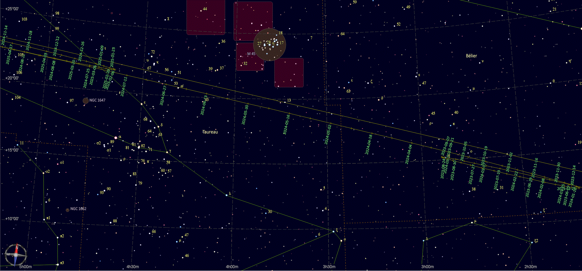 – A 5h16, la Lune arrive devant la constellation du Verseau (Aqr) ; longitude 326°50’ (27e VER) ; latitude -3°01’, monte.