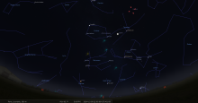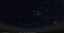 - A 23h40, la Lune est conjointe à Vénus dans le plan équatorial, la planète 2°15’ au Nord ; élongation solaire de Vénus 44° Est